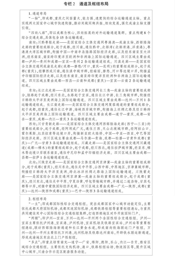 其中,“一軸”是成都、重慶之間容量大、能力強(qiáng)、速度快的綜合運(yùn)輸通道主軸,“四向八廊”是以成都為核心、四向拓展的對外運(yùn)輸通道集群,重點構(gòu)建8個綜合交通走廊,具體包含15條運(yùn)輸通道。“一主”即成都國際性綜合交通樞紐,“兩輔”為瀘州—宜賓、萬州—達(dá)州—開州兩個全國性綜合交通樞紐,“多點”是重點培育南充—遂寧—廣安、綿陽、德陽、樂山、內(nèi)江—自貢、雅安區(qū)域綜合交通樞紐。