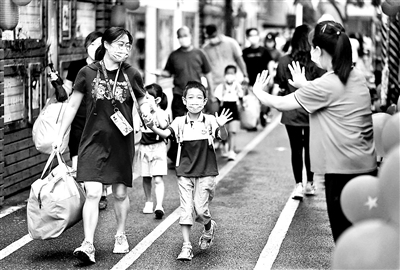 昨天(5日),北京市幼兒園幼兒返園。上午七點(diǎn)半,北京青年報(bào)記者在北京市豐臺(tái)區(qū)豐臺(tái)第一幼兒園門口看到,該幼兒園老師早早就站在門口等待孩子們返園,并為孩子們準(zhǔn)備了以“疫別多日 美好重啟”為主題的返園儀式。整個(gè)幼兒園也被氣球、卡通圖案裝飾一新。