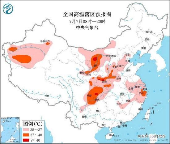 預計7月7日白天,新疆南疆盆地、內蒙古西部、甘肅中東部、寧夏中北部、陜西中南部、四川盆地、重慶、山西中南部、河北中南部、北京中東部、河南中西部、湖北西部、安徽中南部、江蘇中南部、上海、浙江等地有35℃以上高溫,其中,南疆盆地、內蒙古西部、寧夏北部、陜西關中、山西西南部、河南西北部、浙江北部、四川盆地、重慶西部等地部分地區(qū)最高氣溫37~39℃,局地可達40℃以上。