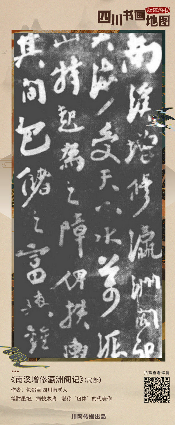 《南溪增修瀛洲閣記》,行書,堪稱“包體”的代表作。由包弼臣寫于1884年(光緒十年)甲,時年53歲。此作雄強恣肆、飛動震蕩、神完氣足之勢所震撼;細觀其妙,又被那些楷草結(jié)合、錯落有致、碑味帖意、牝牡相得、滿目新奇的筆調(diào)拍案叫絕。筆酣墨飽,痛快淋漓,既有北碑沉郁雄強之力感,又有南帖那種瀟灑飛動之神采。《南溪增修瀛洲閣記》的木刻版現(xiàn)尚存。