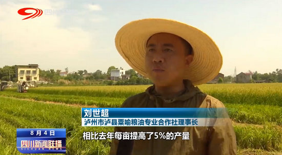瀘縣粟喻糧油專業(yè)合作社理事長(zhǎng) 劉世超:相比去年每畝提高了5%的產(chǎn)量。我們專合社從收割到烘干都采用了全程機(jī)械化,預(yù)計(jì)每畝能節(jié)本增收500元左右。
