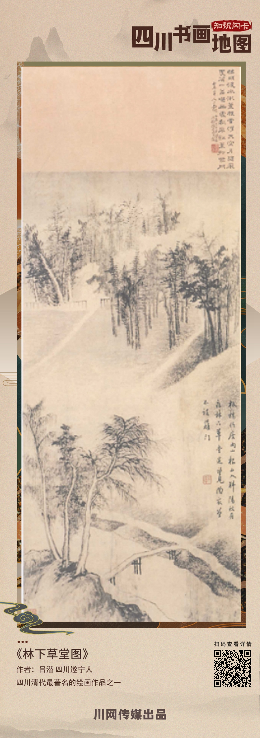 呂潛《林下草堂圖》軸,紙本,墨筆,縱85厘米,橫41.4厘米。現(xiàn)藏北京故宮博物院。此畫列入林樹中主編《美術(shù)辭林》(中國繪畫卷·上卷)的“作品賞析”,是其介紹的117幅清代繪畫作品(含壁畫)之一,四川僅此一幅列入,同時,《收藏辭典》也專門介紹了此畫,因此可說此畫應為四川清代最著名的繪畫作品之一。