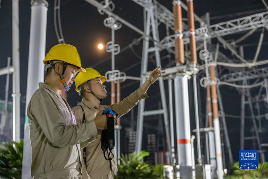 電力工人開展夜間紅外測溫工作,確保德寶直流穩(wěn)定運行。(受訪者供圖)