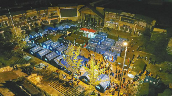 9月5日晚,瀘定縣磨西鎮(zhèn)貢嘎廣場(chǎng)的臨時(shí)安置點(diǎn)燈火通明。 記者 吳聃 攝