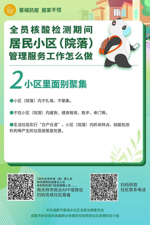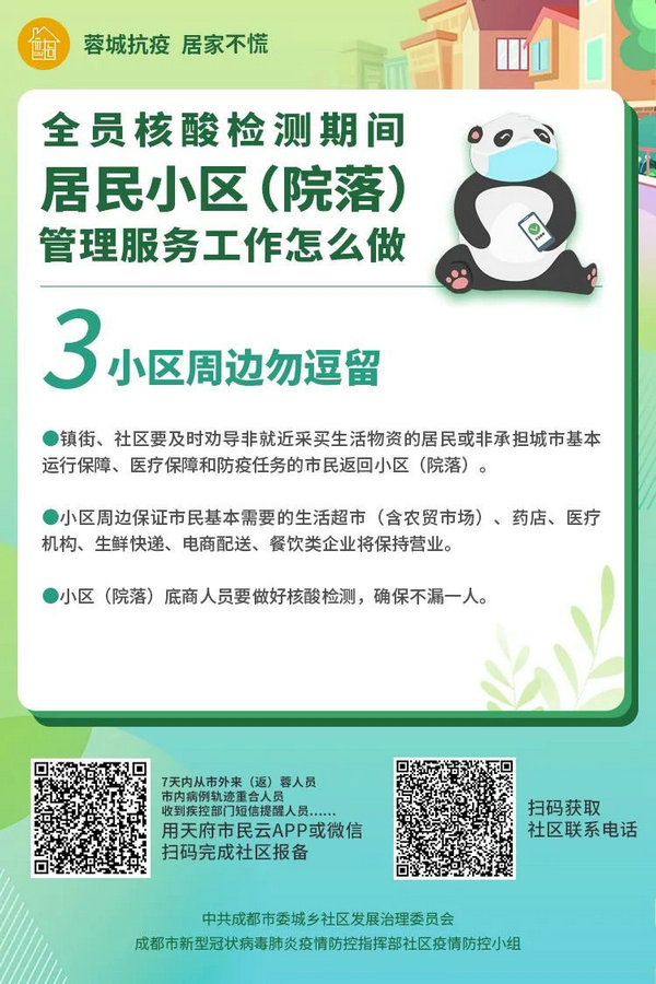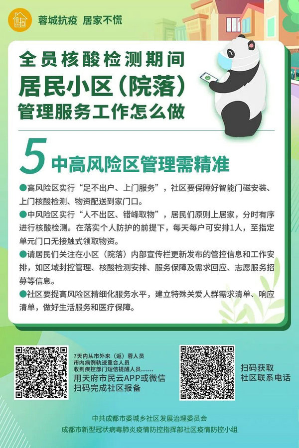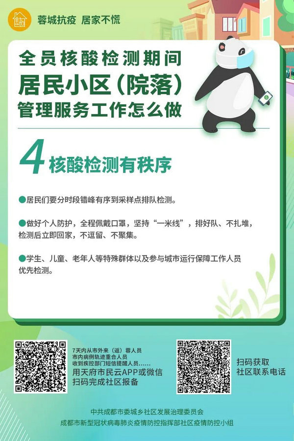 在全員核酸檢測期間,居民小區(qū)(院落)管理服務(wù)工作怎么做?9月5日,成都市委社治委發(fā)布相關(guān)指南。