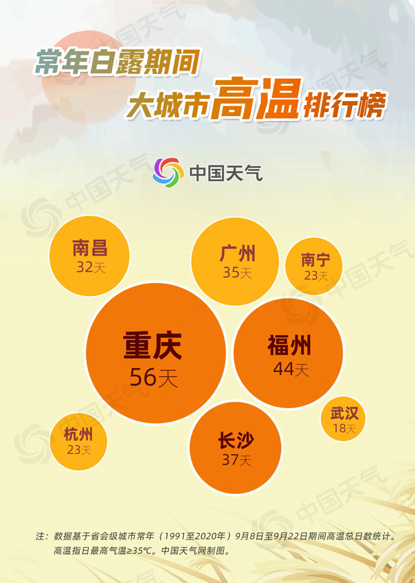 中國(guó)天氣網(wǎng)統(tǒng)計(jì)了近30年來(lái)白露期間大城市高溫日數(shù),位列榜首的是各類高溫榜單的“常客”重慶,30年里白露期間共有56天出現(xiàn)高溫,平均到每年大約為2天。不過(guò)與盛夏時(shí)節(jié)動(dòng)不動(dòng)持續(xù)多天40℃+的情況,不可同日而語(yǔ)。