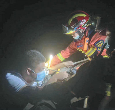 9月5日晚,在四川省瀘定縣得妥鎮(zhèn)聯(lián)合村隧道入口處,消防人員正轉(zhuǎn)移被困群眾。