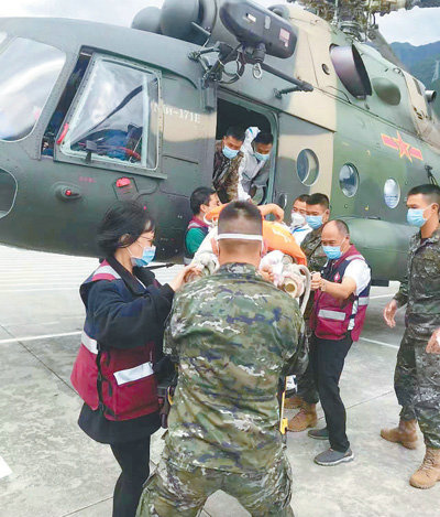 9月6日,在四川省瀘定縣瀘橋鎮(zhèn),四川省人民醫(yī)院赴瀘定醫(yī)療隊(duì)醫(yī)務(wù)人員正接診直升機(jī)轉(zhuǎn)運(yùn)出來(lái)的傷員。