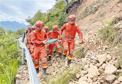 9月7日,四川省森林消防總隊(duì)涼山支隊(duì)直屬大隊(duì)消防員在瀘定縣得妥鎮(zhèn)轉(zhuǎn)移受傷群眾。
