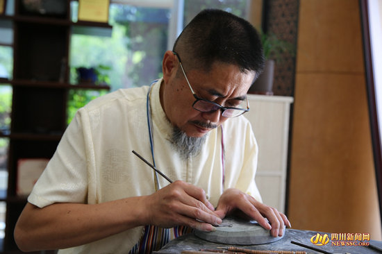 原來,這里是苴卻硯雕刻技藝省級代表性傳承人任述斌的舞臺。今年55歲的他,12歲學(xué)藝,15歲承傳雕刻技藝,隨父游歷民間石刻。酷愛民間繪畫和雕刻的任述斌,憑著天賦和激情,在一塊塊苴卻硯上展示技藝,雕磨著自己的人生。在記者提出想“拜師學(xué)藝”時(shí),任述斌立刻戴上了眼鏡,把記者招呼到工作臺前,展示著早已被磨得發(fā)亮的工具,“喜歡就不會覺得枯燥。”在外人看來這項(xiàng)需要沉下心來的工作,對他而言,反而是“桃花源”。