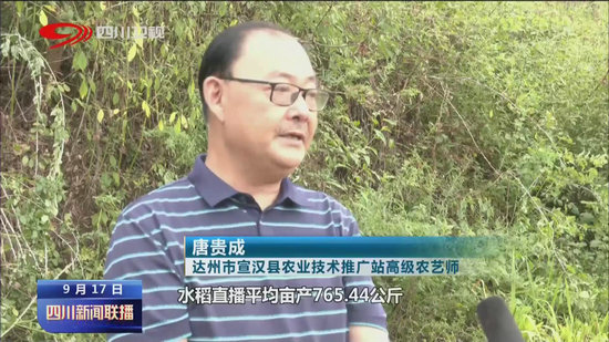宣漢縣農(nóng)業(yè)技術(shù)推廣站高級農(nóng)藝師 唐貴成:水稻直播平均畝產(chǎn)765.44公斤,比去年增加63.02公斤,最高畝產(chǎn)達776.69公斤。