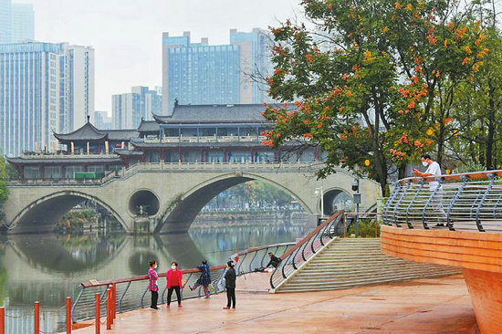 9月16日,市民在成都市安順廊橋附近休閑游憩。 記者 華小峰 攝