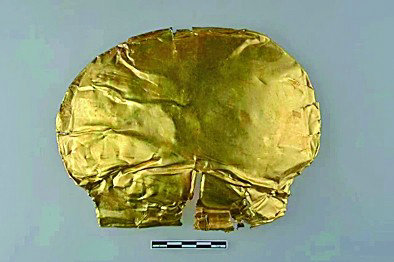 鄭州商城遺址高等級貴族墓M2中出土的金覆面 新華社發(fā)