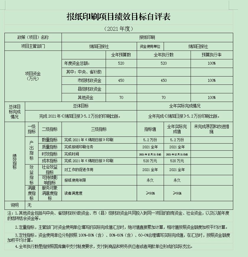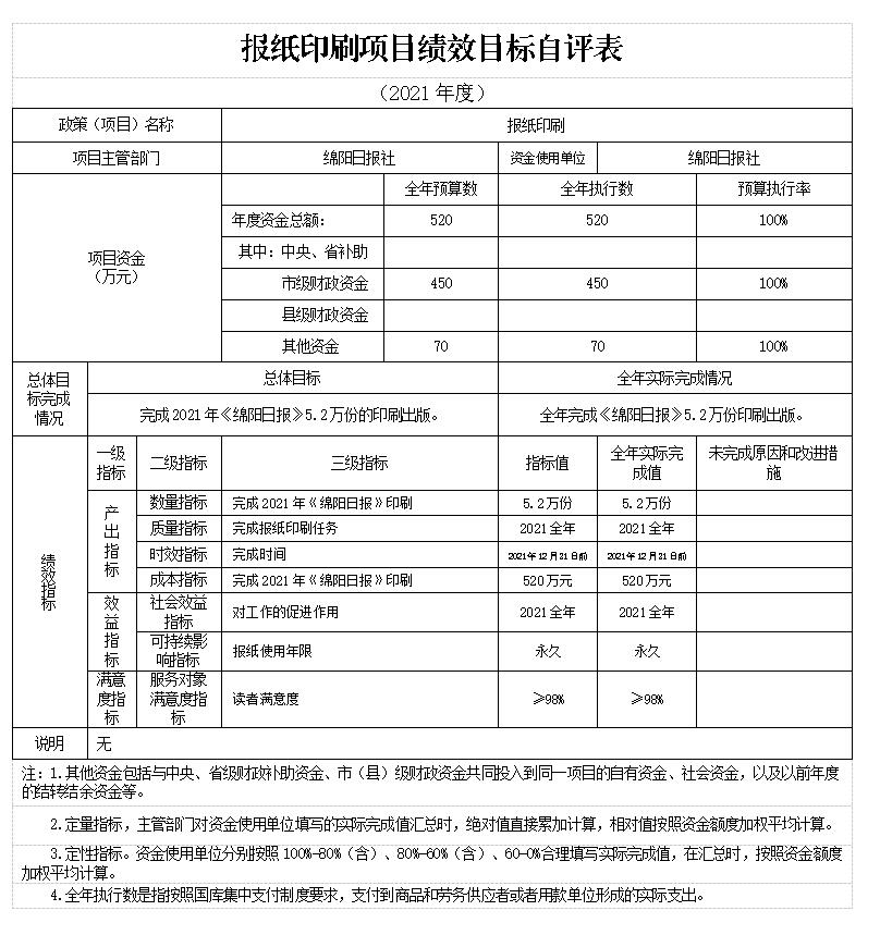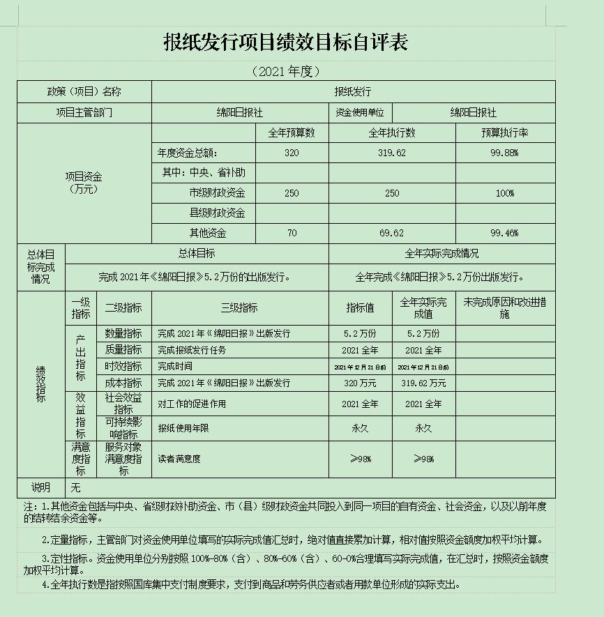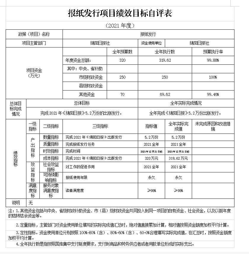 項目完成指標(biāo):截止2021年12月31日保質(zhì)保量按時完成了《綿陽日報》2021年5.2萬份的報紙發(fā)行任務(wù)。