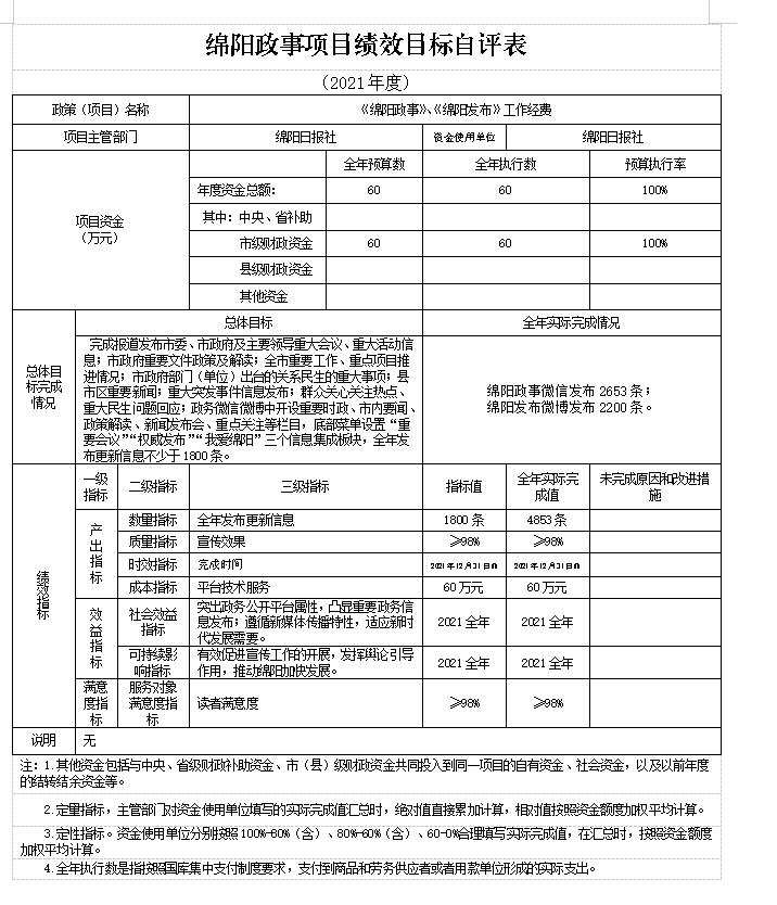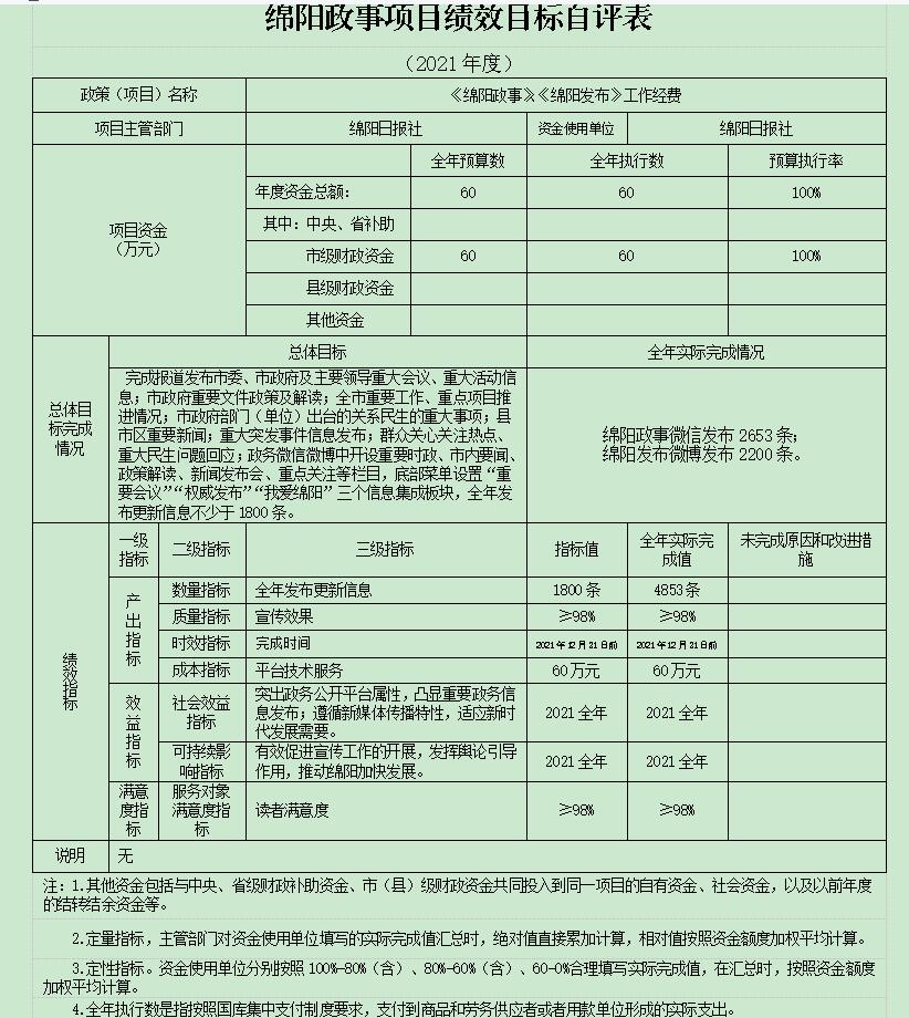 3、《綿陽政事》《綿陽發(fā)布》工作經(jīng)費(fèi)項目年初財政撥款預(yù)算數(shù)60.00萬元,執(zhí)行數(shù)為60.00萬元,完成年初預(yù)算的100%。通過項目實施,完成報道發(fā)布市委、市政府重大會議、重大活動信息;市政府重要文件政策及解讀;全市重要工作、重點(diǎn)項目推進(jìn)情況;市政府部門(單位)出臺的、政府信息公開關(guān)系民生的重大事項;縣市區(qū)重要新聞;重大突發(fā)事件信息發(fā)布;群眾關(guān)心關(guān)注熱點(diǎn)、重大民生問題回應(yīng);政務(wù)微信微博中開設(shè)重要時政、市內(nèi)要聞、政策解讀、新聞發(fā)布會、重點(diǎn)關(guān)注等欄目,底部菜單設(shè)置“重要會議”“權(quán)威發(fā)布”“我愛綿陽”三個信息集成板塊,全年發(fā)布更新信息達(dá)到了綿陽政事微信發(fā)布2653條,綿陽發(fā)布微博發(fā)布2200條。2021年《綿陽政事》被省委網(wǎng)信辦、省政府新聞辦等部門評為“微政四川2021年度優(yōu)秀政務(wù)公開典型案例”。