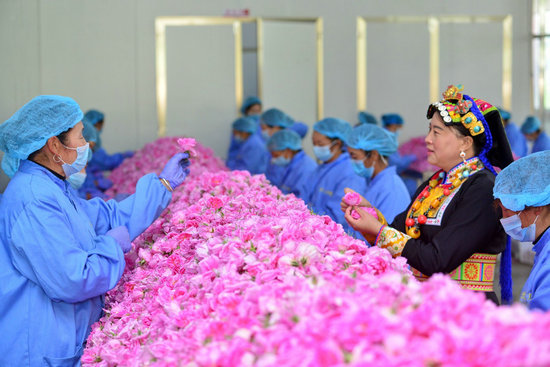 小金玫瑰加工車間,工人們?cè)诰x玫瑰花。資料圖 小金縣委宣傳部提供