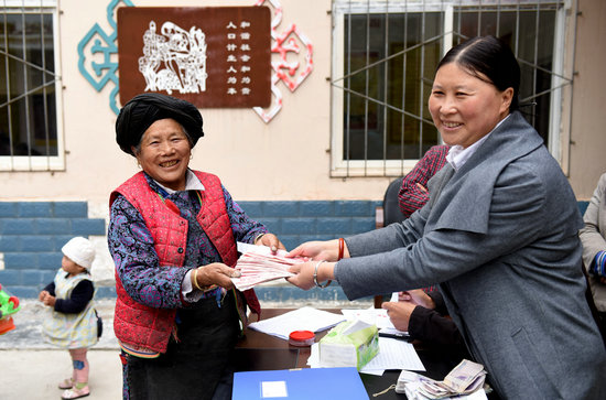 陳望慧向村民發(fā)放玫瑰花款。資料圖 小金縣委宣傳部提供