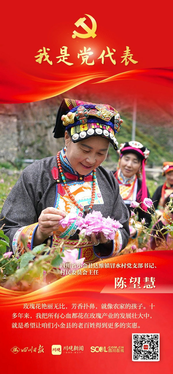 陳望慧,阿壩州小金縣達(dá)維鎮(zhèn)冒水村黨支部書記、村委會(huì)主任,2011年3月加入中國(guó)共產(chǎn)黨,帶動(dòng)46個(gè)村3200多戶村民種玫瑰實(shí)現(xiàn)脫貧增收,曾獲得“全國(guó)脫貧攻堅(jiān)先進(jìn)個(gè)人”“全國(guó)優(yōu)秀共產(chǎn)黨員”“全國(guó)三八紅旗手”等榮譽(yù)。