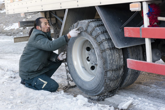 冰雪路上,其美多吉給汽車加掛鏈條。省委組織部供圖
