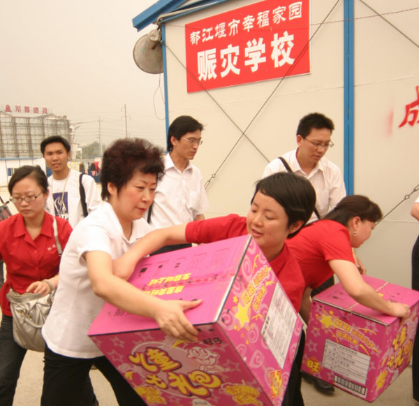“5·12”地震后,紅旗連鎖向都江堰幸福家園賑災(zāi)學(xué)校送兒童節(jié)禮包。圖片由受訪者提供