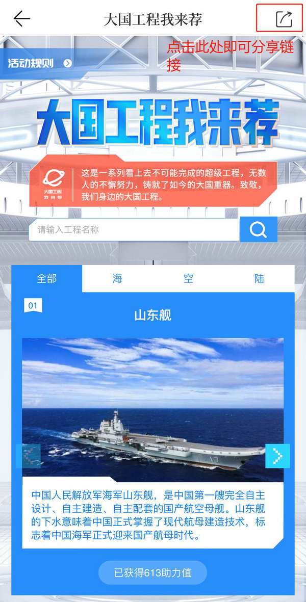 每分享1次活動(dòng)頁面,可獲得1次投送航母的機(jī)會(huì)。每投送1次航母,可為該工程增加10個(gè)助力值。(注:分享成功后,須立即將所獲航母投送,然后才能繼續(xù)分享,繼續(xù)獲得投送航母的機(jī)會(huì)。每日航母投送次數(shù)上限為10次。)