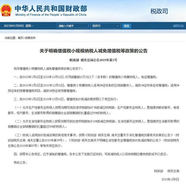 公告提出,自2023年1月1日至2023年12月31日,對月銷售額10萬元以下(含本數(shù))的增值稅小規(guī)模納稅人,免征增值稅。
