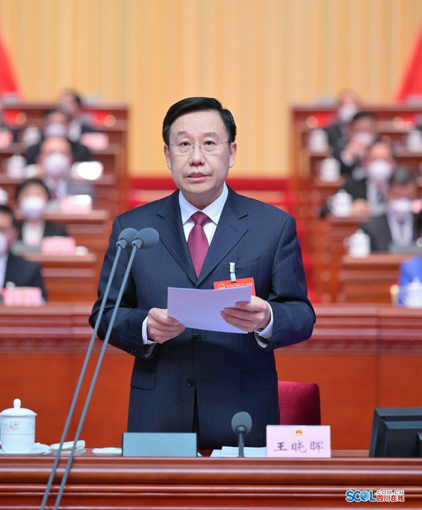 上午9時,王曉暉宣布:四川省第十四屆人民代表大會第一次會議開幕。全體起立,奏唱中華人民共和國國歌。