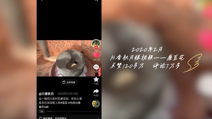 她憑借一條磨豆花的短視頻一夜爆火,瞬間漲粉50萬。通過短短兩年的時(shí)間,她的粉絲就達(dá)到1100余萬、累計(jì)獲贊超過1.3億人次。