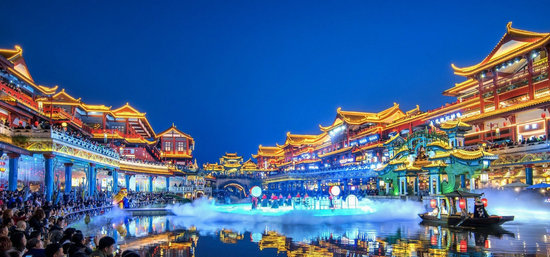 眉山東坡特色水街從大年初一開(kāi)始連續(xù)出現(xiàn)游客“摩肩接踵”熱鬧景象。春節(jié)期間,水街推出盛大夜游活動(dòng),燈火閃耀、流光溢彩,祈福大典、穿越集市、投壺活動(dòng)以及漢舞、儺舞等表演,讓游客“夢(mèng)回大宋”,也感受東坡故里的濃郁文化氛圍。