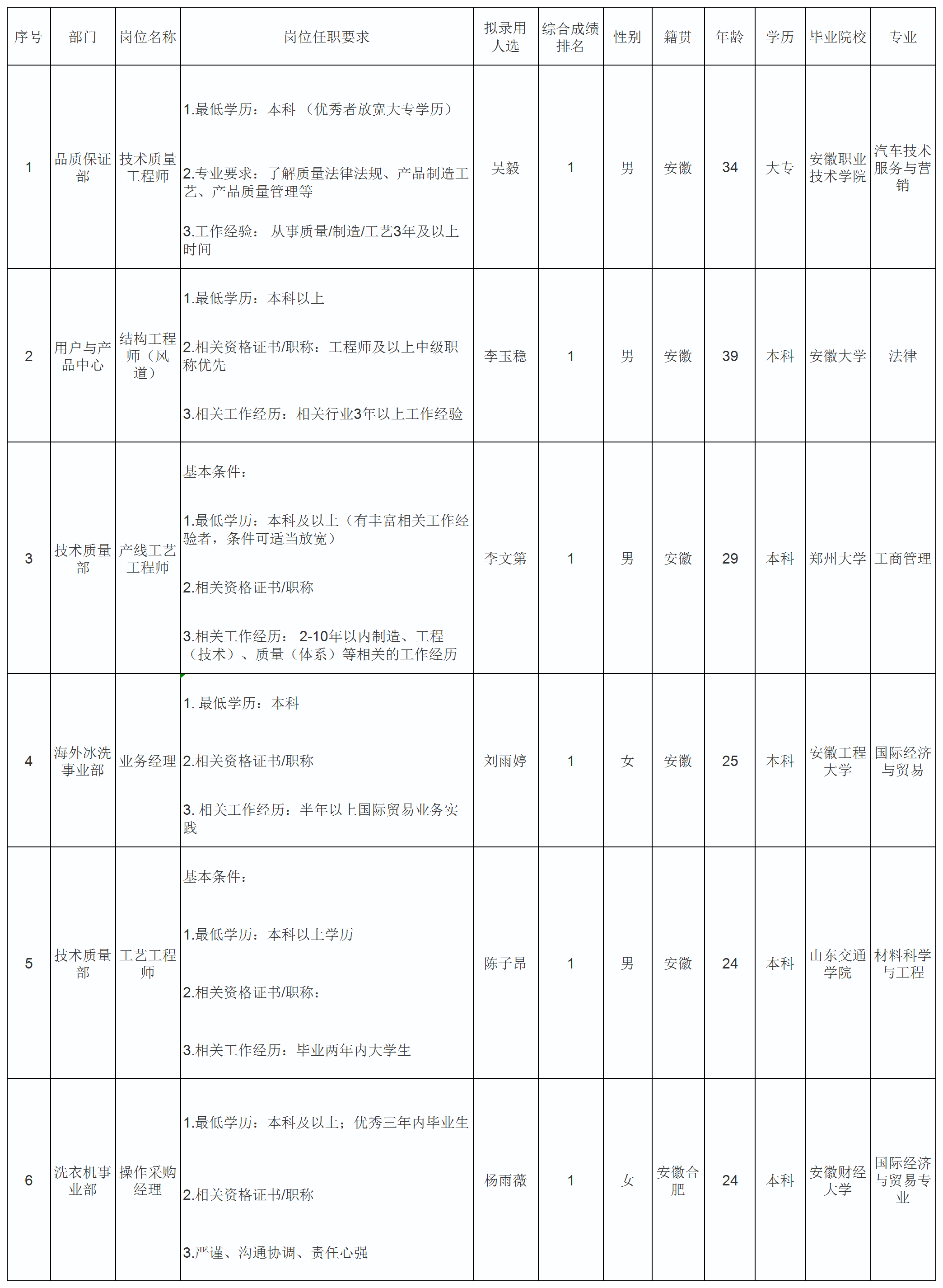 根據(jù)長虹美菱股份有限公司發(fā)布的招聘公告及招聘相關(guān)規(guī)定,經(jīng)筆試、面試、考察、體檢等程序,擬錄用李文第等同志到技術(shù)質(zhì)量部部門工作,現(xiàn)予以公示,具體情況如下:
