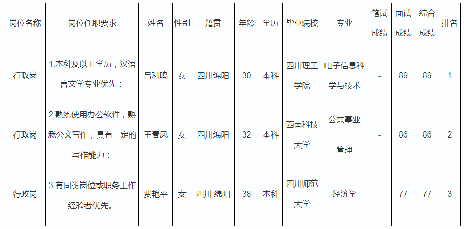 根據(jù)四川九洲教育投資管理有限公司發(fā)布的招聘公告及招聘相關(guān)規(guī)定,經(jīng)筆試、面試等程序,現(xiàn)將筆試(面試)成績予以公示。