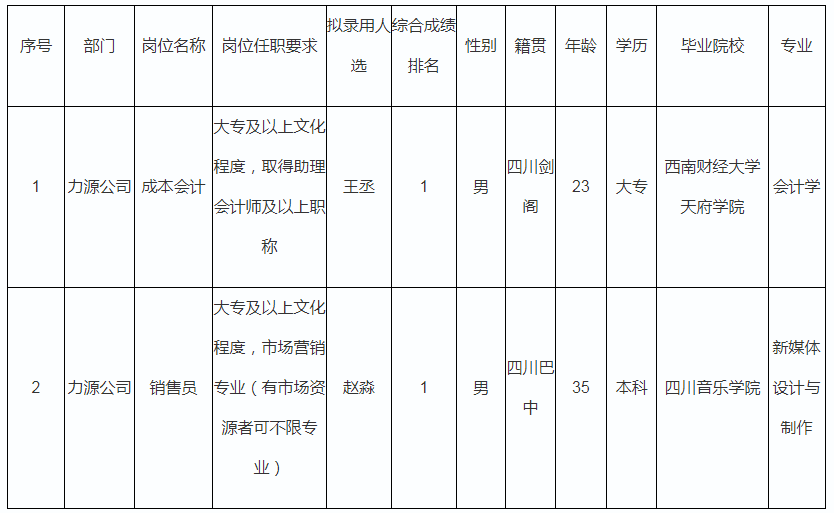 根據(jù)零八一電子集團四川力源電子有限公司發(fā)布的招聘公告及招聘相關(guān)規(guī)定,經(jīng)筆試、面試、考察、體檢等程序,擬錄用王丞、趙淼同志到力源公司工作,現(xiàn)予以公示,具體情況如下: