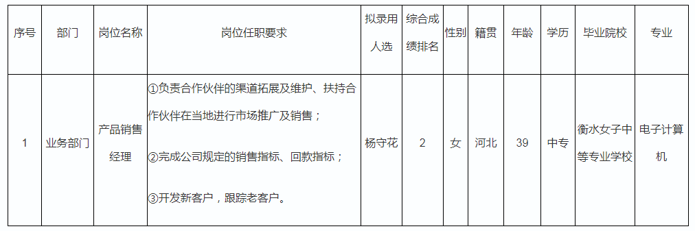 根據(jù)四川長虹佳華信息產(chǎn)品有限責(zé)任公司發(fā)布的招聘公告及招聘相關(guān)規(guī)定,經(jīng)筆試、面試、考察、體檢等程序,擬錄用楊守花同志到四川長虹佳華信息產(chǎn)品有限責(zé)任公司工作,現(xiàn)予以公示,具體情況如下: