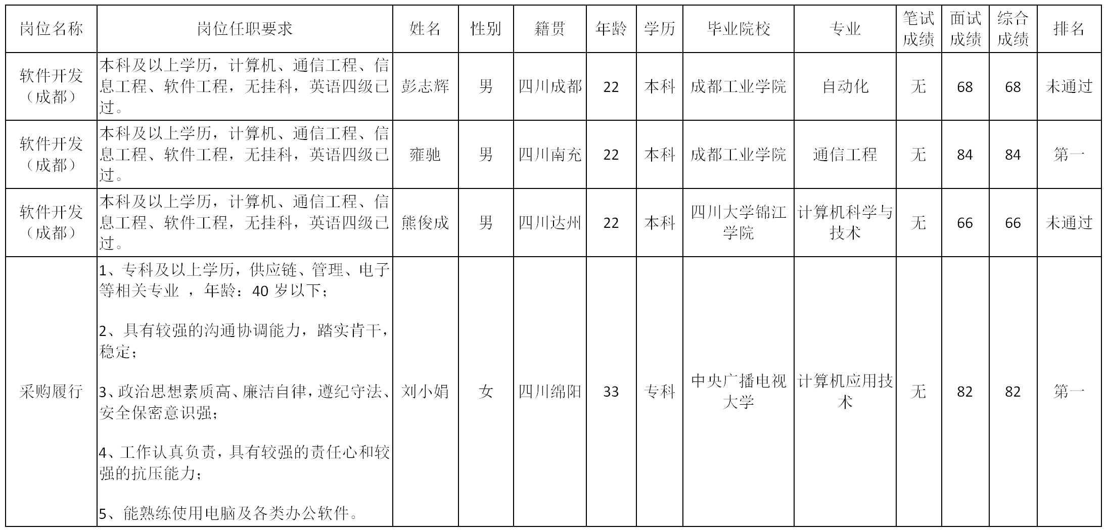 根據(jù)四川九州電子科技股份有限公司發(fā)布的招聘公告及招聘相關(guān)規(guī)定,經(jīng)筆試、面試等程序,現(xiàn)將筆試(面試)成績(jī)予以公示。
