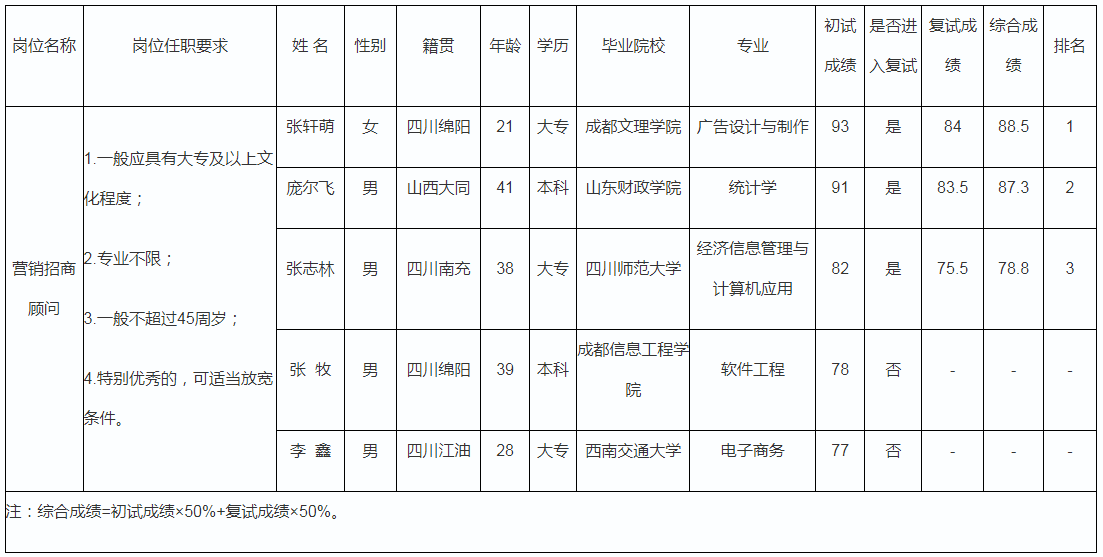 根據(jù)綿陽市高水農(nóng)副產(chǎn)品批發(fā)有限公司發(fā)布的招聘公告及招聘相關(guān)規(guī)定,經(jīng)資格審查、初試、復(fù)試等程序,現(xiàn)將成績(jī)予以公示,公示名單如下。