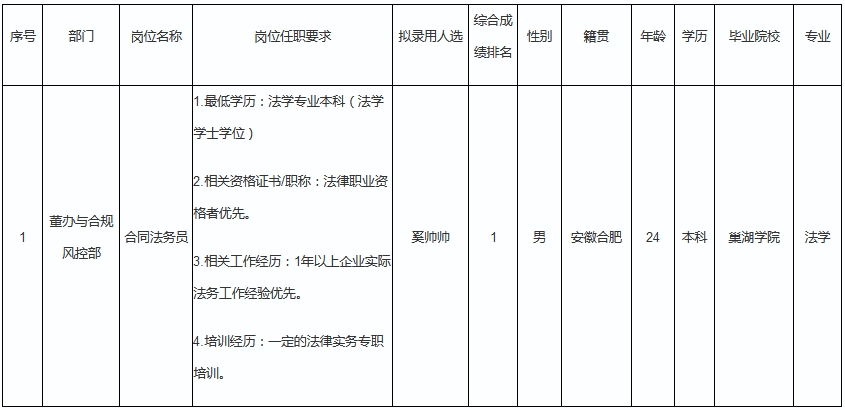 根據(jù)長(zhǎng)虹美菱股份有限公司發(fā)布的招聘公告及招聘相關(guān)規(guī)定,經(jīng)面試、體檢等程序,擬錄用奚帥帥同志到董辦與合規(guī)風(fēng)控部門工作,現(xiàn)予以公示,具體情況如下: