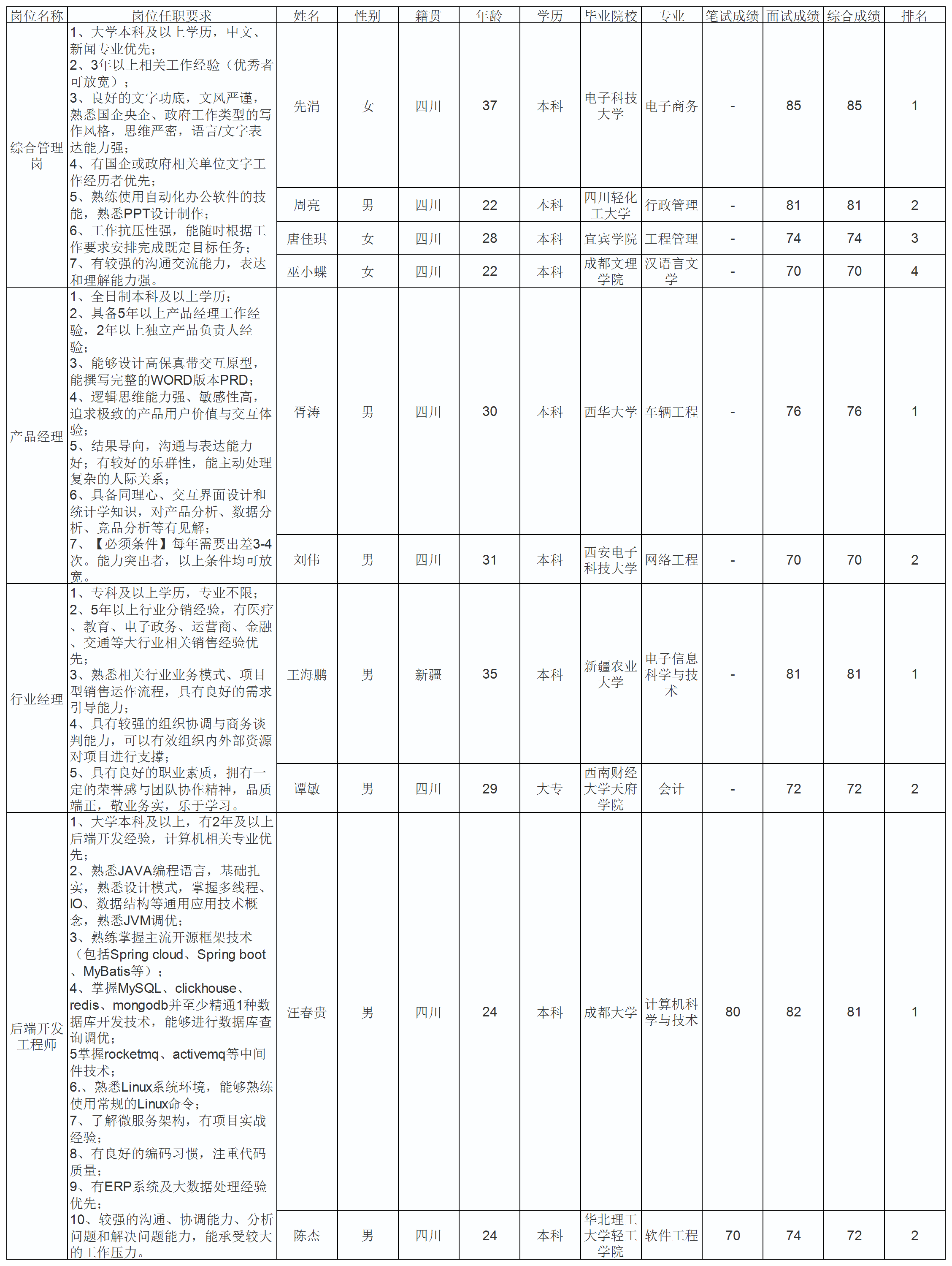 根據(jù)四川科瑞軟件有限責(zé)任公司發(fā)布的招聘公告及招聘相關(guān)規(guī)定,經(jīng)筆試、面試等程序,現(xiàn)將筆試(面試)成績(jī)予以公示。