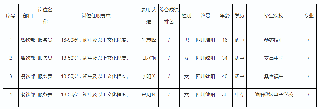根據(jù)綿陽市綿州嘉來會務(wù)服務(wù)有限公司發(fā)布的招聘公告及招聘相關(guān)規(guī)定,經(jīng)面試、體檢等程序,錄用以下人員到綿陽市綿州嘉來會務(wù)服務(wù)有限公司工作,現(xiàn)予以公示,具體情況如下: