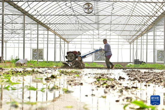 1月29日,在湖南省婁底市雙峰縣青樹坪鎮(zhèn)歸古新村,農(nóng)民駕駛農(nóng)機在大棚內(nèi)整地。新華社發(fā)(李建新 攝)