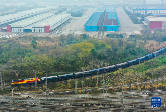 1月22日,農(nóng)歷新年首趟西部陸海新通道鐵海聯(lián)運班列從重慶團(tuán)結(jié)村中心站發(fā)車(無人機照片)。新華社記者 劉潺 攝