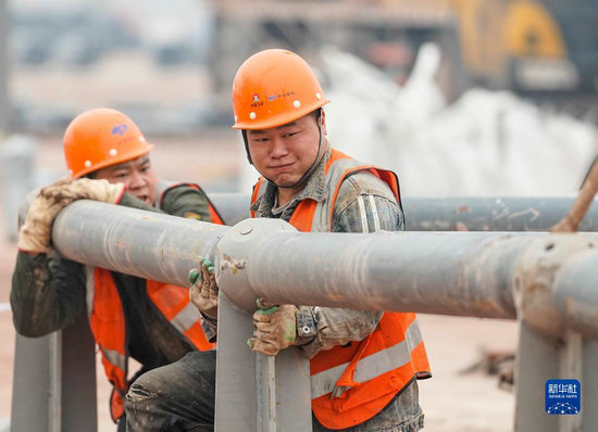 1月23日,工人在重慶兩江新區(qū)新能源汽車產(chǎn)業(yè)園基礎(chǔ)設(shè)施配套項目現(xiàn)場進(jìn)行鋼結(jié)構(gòu)材料拼裝作業(yè)。新華社記者 劉潺 攝