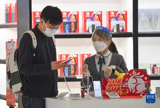1月19日,消費者在中免集團(tuán)海口日月廣場免稅店選購電子產(chǎn)品。新華社記者 蒲曉旭 攝