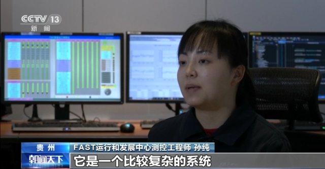 FAST運行和發(fā)展中心測控工程師 孫純:因為這個望遠鏡它是一個比較復(fù)雜的系統(tǒng),它需要反射面和饋源艙去實時地高精度配合,就是高精度指向我們觀測的天體,所以就需要我們實時地監(jiān)測望遠鏡的狀態(tài)。