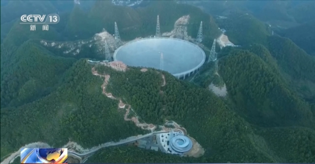通過遙感衛(wèi)星數(shù)字地球技術(shù),我們首先聚焦貴州省黔南州平塘縣的大窩凼,這里坐落著500米口徑球面射電望遠鏡FAST。這座被稱作“中國天眼”的望遠鏡,是目前世界上口徑最大,靈敏度最高的單口徑射電望遠鏡,其反射面面積大約相當(dāng)于30個標(biāo)準(zhǔn)足球場大小。農(nóng)歷兔年春節(jié)過后,記者在中國天眼的總控室看到,科研人員們正在對望遠鏡的運行狀態(tài)進行監(jiān)控,并搜集和記錄著來自宇宙的數(shù)據(jù)信息。