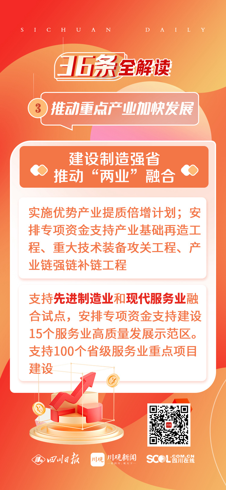 機(jī)器人產(chǎn)業(yè)加速聚集,是四川推動(dòng)重點(diǎn)產(chǎn)業(yè)加快發(fā)展的一個(gè)縮影。近日,省政府印發(fā)《聚焦高質(zhì)量發(fā)展推動(dòng)經(jīng)濟(jì)運(yùn)行整體好轉(zhuǎn)的若干政策措施》,包含十個(gè)方面36條政策措施(下稱“36條”)。其中有6條政策措施對(duì)推動(dòng)重點(diǎn)產(chǎn)業(yè)加快發(fā)展進(jìn)行了專門部署,包括實(shí)施優(yōu)勢(shì)產(chǎn)業(yè)提質(zhì)倍增計(jì)劃、支持制造強(qiáng)省重大工程建設(shè)、開展重大產(chǎn)業(yè)化項(xiàng)目招引專項(xiàng)行動(dòng)、推動(dòng)重大科技成果加速落地轉(zhuǎn)化、支持先進(jìn)制造業(yè)和現(xiàn)代服務(wù)業(yè)融合、加快建設(shè)新時(shí)代更高水平“天府糧倉”等6個(gè)方面。