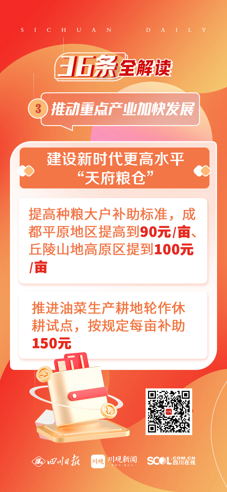 農(nóng)業(yè)是國民經(jīng)濟(jì)基礎(chǔ)產(chǎn)業(yè),四川正加快建設(shè)新時(shí)代更高水平“天府糧倉”,“36條”中提出了一系列對(duì)農(nóng)田、農(nóng)業(yè)生產(chǎn)相關(guān)的補(bǔ)貼標(biāo)準(zhǔn),守護(hù)糧食安全,夯實(shí)農(nóng)業(yè)發(fā)展的基礎(chǔ)。