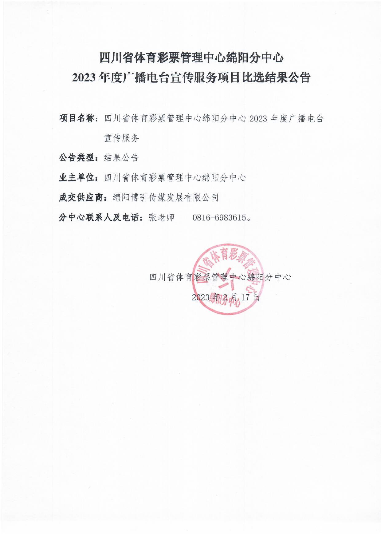四川省體育彩票管理中心綿陽分中心2023年度廣播電臺宣傳服務(wù)項(xiàng)目比選結(jié)果公告
