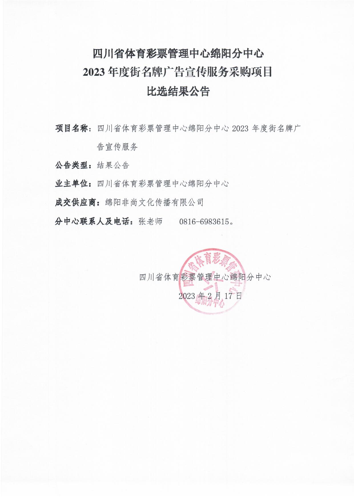 四川省體育彩票管理中心綿陽分中心2023年度街名牌廣告宣傳服務(wù)采購項目比選結(jié)果公告