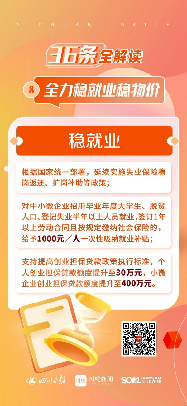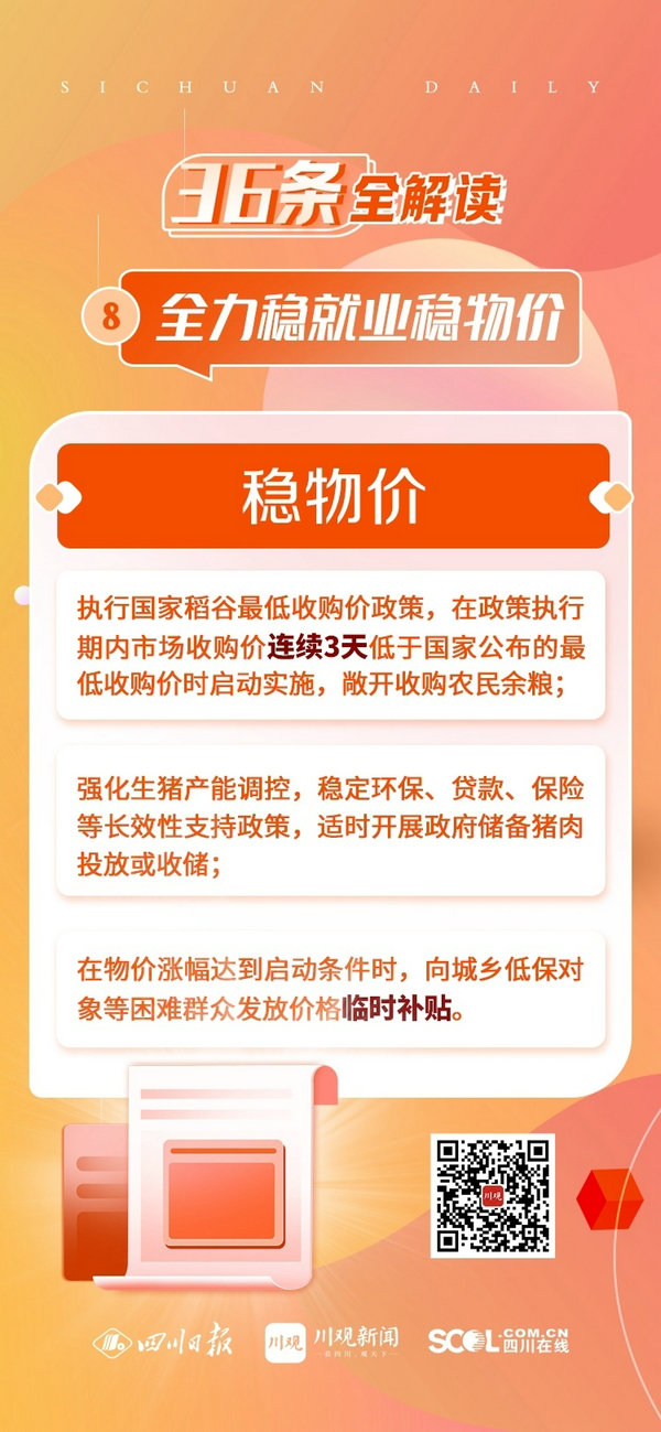 穩(wěn)就業(yè)穩(wěn)物價有利于促進(jìn)經(jīng)濟(jì)良性發(fā)展和高質(zhì)量發(fā)展。“36條”提出“全力穩(wěn)就業(yè)穩(wěn)物價”,并圍繞這一目標(biāo)提出援企穩(wěn)崗、擴(kuò)崗增容、重點群體就業(yè)等一系列穩(wěn)就業(yè)“組合拳”,以及執(zhí)行國家稻谷最低收購價政策、強(qiáng)化生豬產(chǎn)能調(diào)控等務(wù)實舉措。這些措施和舉措都有什么樣的特點,如何為經(jīng)濟(jì)運行整體好轉(zhuǎn)助力?四川在線記者請相關(guān)部門負(fù)責(zé)人進(jìn)行了權(quán)威解讀。