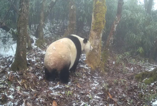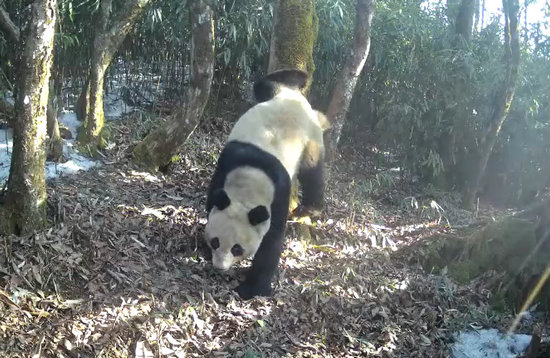 2月9日,大相嶺的野外實時監(jiān)控再次拍到那只倒立撒尿的大熊貓。(大熊貓國家公園滎經(jīng)縣管護總站供圖)